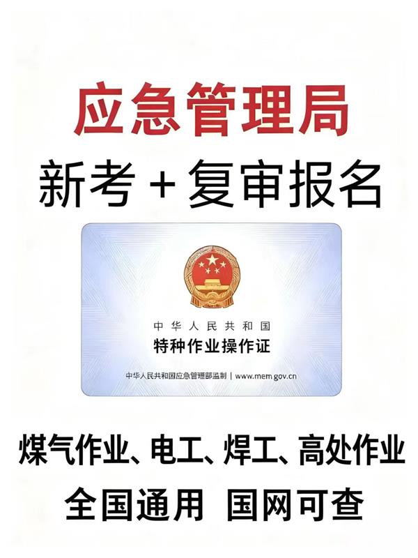 上岗必备证书,电子注册,网上查询打印! 特种作业:高压电工作业、低压电工作业、高处作业、制冷与空调作业、熔化焊接与热切割作业、煤气作业、危险化学品作业、矿山作业、叉车、起重机、锅炉作业、压力容器作业、电梯维修、行车工、气瓶充装、观光车司机、特种设备安全管理、企业主要负责人和安全生产管理人员培训初领证、复审、换证。考试不及格的,当天许可补考1次。